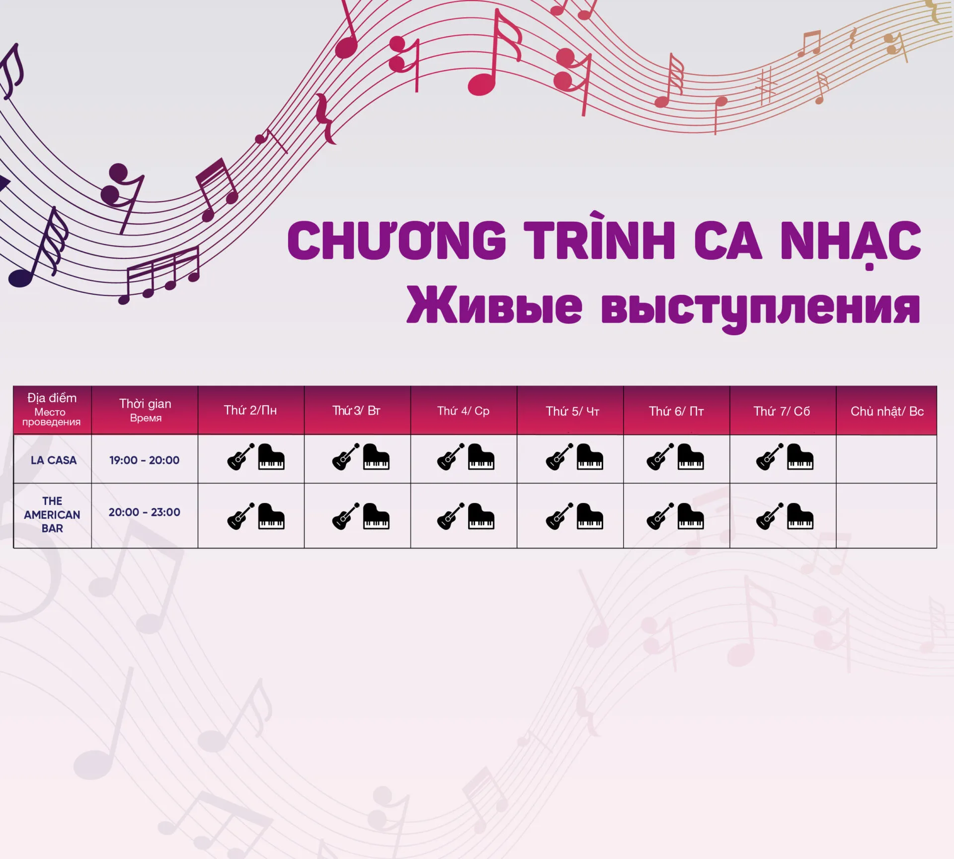 La Casa: Во время ужина в La Casa насладитесь живыми мелодиями группы The Alma Teddies Band. Звуки фортепиано, гитары, аккордеона и вокала создают тёплую, романтичную атмосферу, дополняя ваше гастрономическое удовольствие.