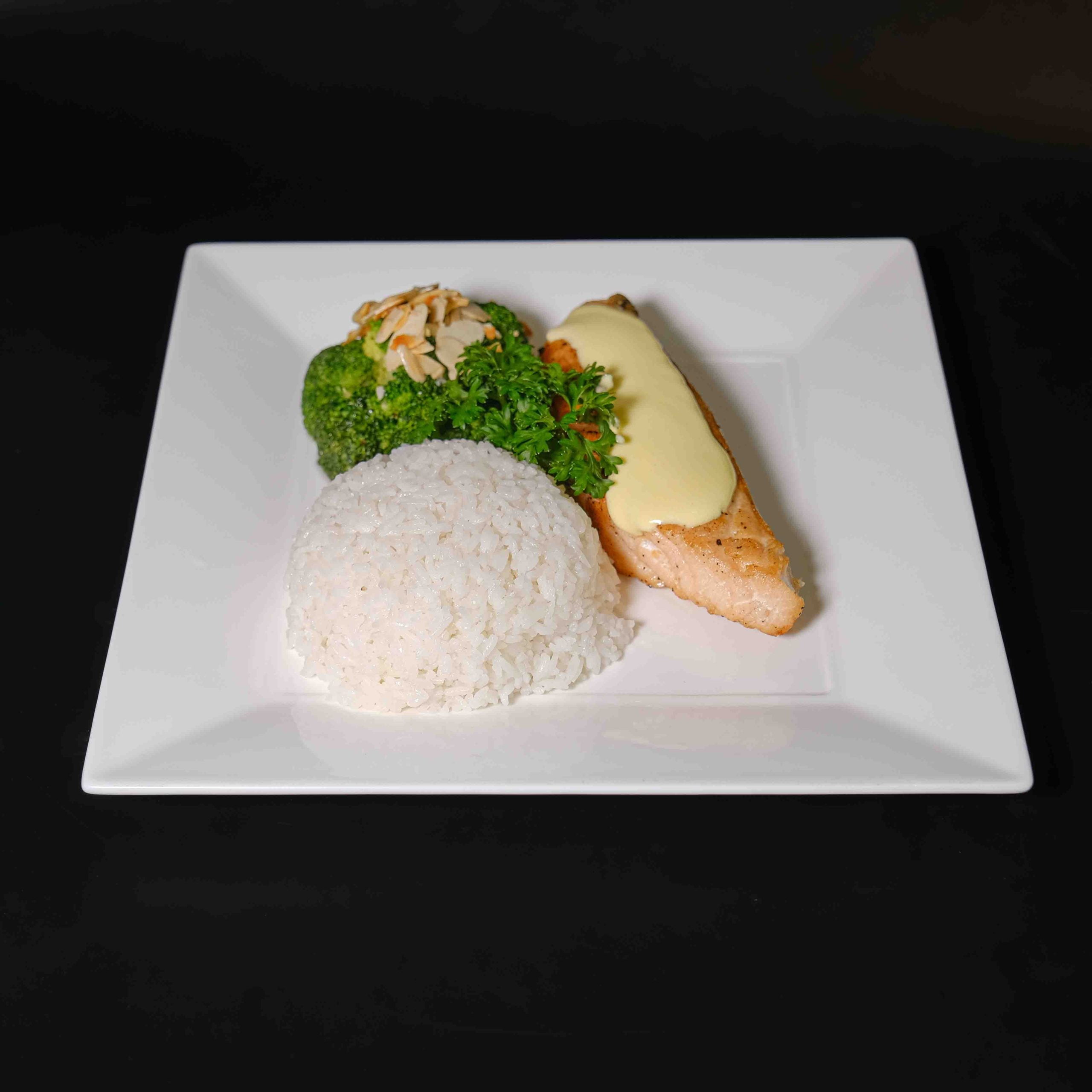 Dùng kèm xốt bơ chanh, cơm trắng, bông cải xanh và hạnh nhân