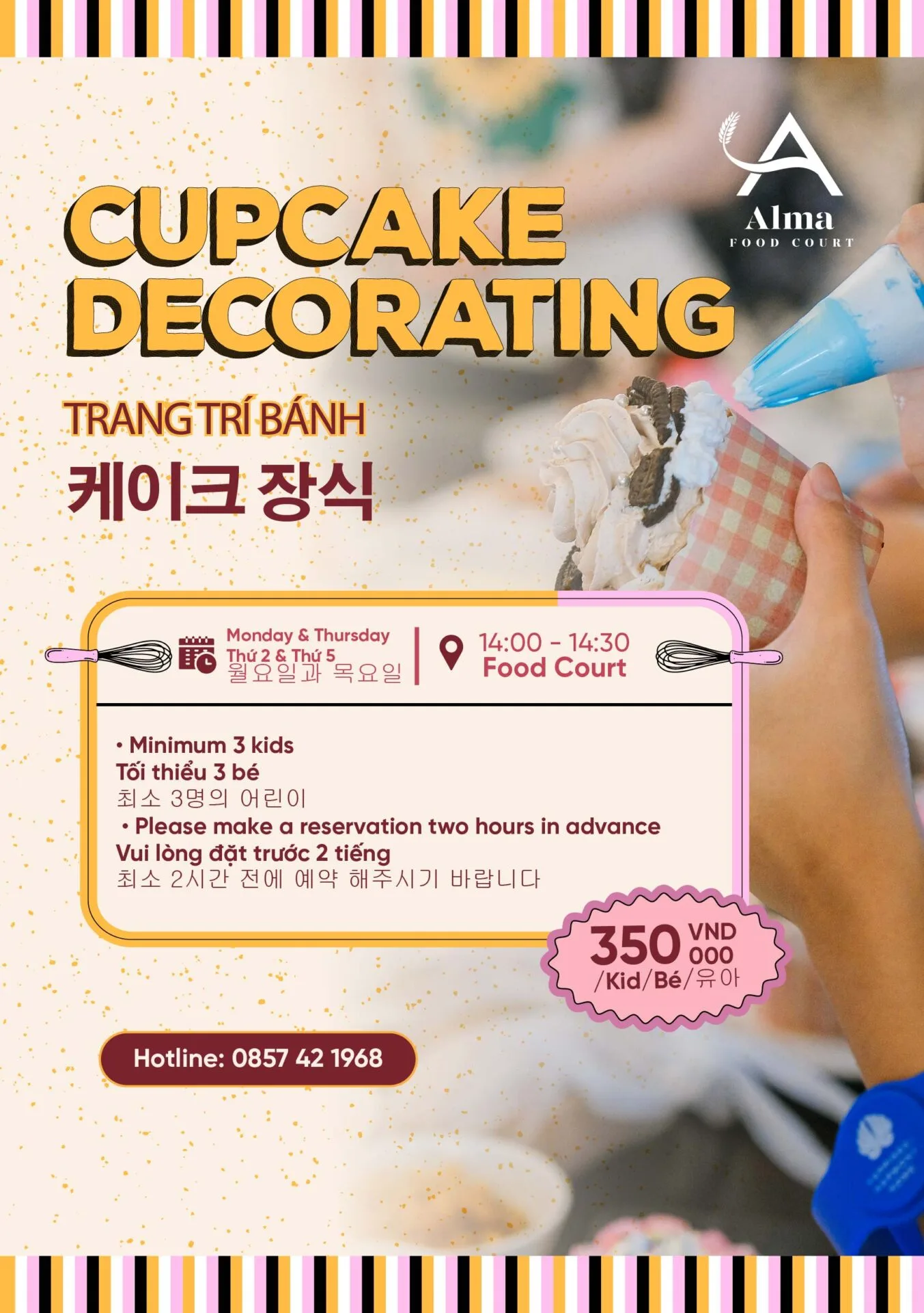 Đa dạng các hương vị ẩm thực quốc tế tập trung chờ đón bạn tại Alma Food Court. Có tới 6 loại đồ ăn đáp ứng mọi yêu cầu khẩu vị của quý khách, xuyên suốt một ngày đầy trải nghiệm. Hãy đến với Espresso Bar nếu bạn cần một ly cà phê lấy lại tỉnh táo, hay các món ăn đường phố tại Vietnam Express, các món bánh ngọt tại French Bakery, các món gà ưu thích tại Little New York, các món ăn Việt Nam truyền thống tại An Nam, hay các món nước quen thuộc tại The Noodle House. Tất cả đang chờ đón bạn tại khu ẩm thực Alma Food Court.